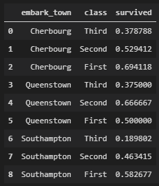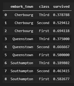 titanic %>% group_by(embark_town, class) %>% summarise(survived_rate=mean(survived!=0)) # A tibble: 10 x 3 # Groups: embark_town [4] embark_town class survived_rate <chr> <chr> <dbl> 1 Cherbourg First 0.694 2 Cherbourg Second 0.529 3 Cherbourg Third 0.379 4 Queenstown First 0.5 5 Queenstown Second 0.667 6 Queenstown Third 0.375 7 Southampton First 0.583 8 Southampton Second 0.463 9 Southampton Third 0.190 10 NA First 1