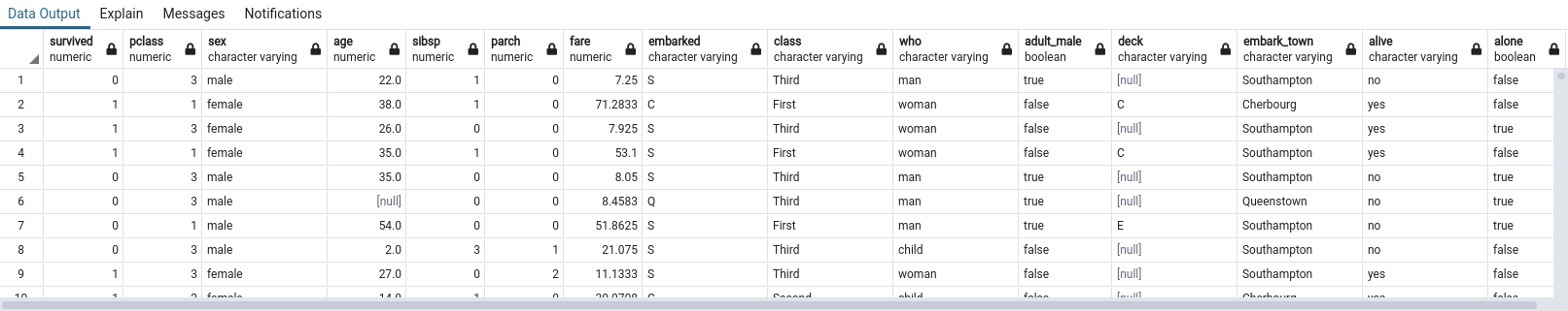 create table titanic ( survived numeric, pclass numeric, sex varchar, age numeric, sibsp numeric, parch numeric, fare numeric, embarked varchar, class varchar, who varchar, adult_male boolean, deck varchar, embark_town varchar, alive varchar, alone boolean ); copy titanic from '/tmp/titanic.csv' csv header; select * from titanic;