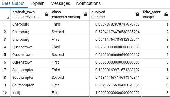 select embark_town, class, avg(survived) as survived, (case when class = 'Third' then 1 when class = 'Second' then 2 when class = 'First' then 3 end) as fake_order from titanic group by embark_town, class order by embark_town, fake_order ;