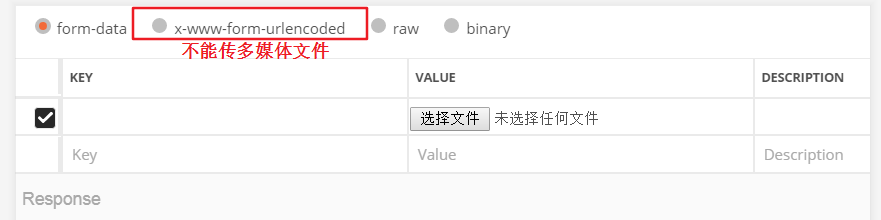 x-www-form-urlencoded:只能上传键值对,并且键值对都是间隔分开的,不能传多媒体文件。
