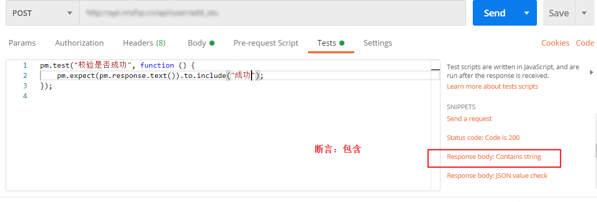 返回参数中包含“成功”,则断言验证通过