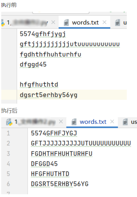 import os with open('words.txt') as fr,open('words_new.txt','w') as fw: for line in fr: line = line.strip() if line: #判断空行 line=line.upper() fw.write(line+'\n') os.remove('words.txt') os.rename('words_new.txt','words.txt')