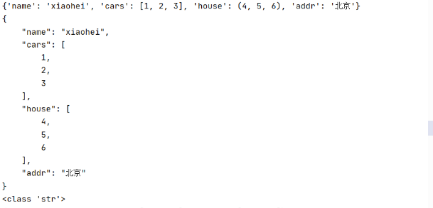 import json d={'name':'xiaohei','cars':[1,2,3],'house':(4,5,6),'addr':'北京'} result = json.dumps(d,ensure_ascii=False,indent=4) print(d) print(result) print(type(result))