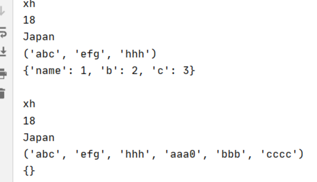 def nb_func(name1,age,country='China',sex='女',*args,**kwargs): #1必填参数 name1,age #2默认值参数 country #3参数组 *args #4关键字参数 **kwargs print(name1) print(age) print(country) print(args) print(kwargs) nb_func('xh',18,'Japan','nan','abc','efg','hhh',name=1,b=2,c=3) print() nb_func('xh',18,'Japan','nan','abc','efg','hhh','aaa0','bbb','cccc')