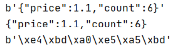 print(r.get('prod'))#b'{"price":1.1,"count":6}' #bytes 字节类型 # f=open('a.jpg','wb') #bytes data=r.get('prod') print(data.decode()) #bytes 字节类型转换成字符串 s='你好' print(s.encode())#变成bytes类型