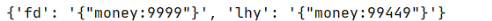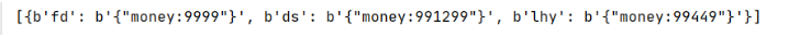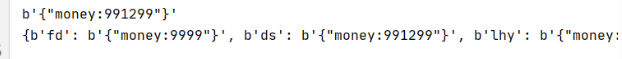 r.hset('student','fd','{"money:9999"}') r.hset('student','ds','{"money:991299"}') r.hset('student','lhy','{"money:99449"}') print(r.hget('student','ds')) print(r.hgetall('student'))