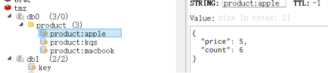 #key中建立文件夹 r.set('product:kqs','{"price":1.1,"count":6}') r.set('product:macbook','{"price":9999,"count":6}') r.set('product:apple','{"price":5,"count":6}')