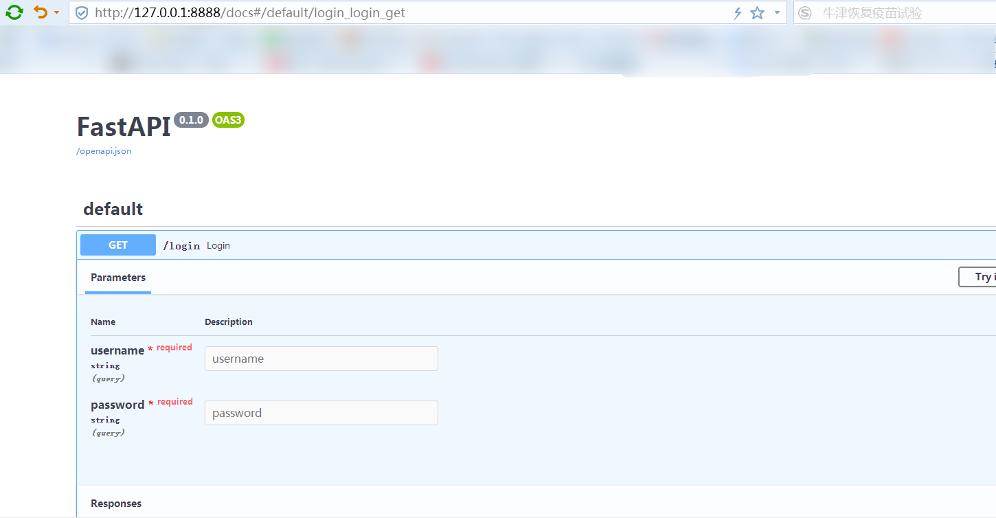 import fastapi import uvicorn server = fastapi.FastAPI() @server.get('/login') def login(username:str,password:str): return {'username':username,'password':password,'code':'0000'} uvicorn.run(server,port=8888,debug=True)