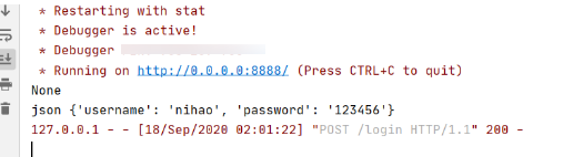 #服务端 server = flask.Flask(__name__) @server.route('/login',methods=['post','get']) def login(): username=flask.request.values.get('username','') #如果取不到默认为空 password=flask.request.values.get('password','') print(flask.request.cookies.get('PHPSESSID')) print('json',flask.request.json) 。。。
