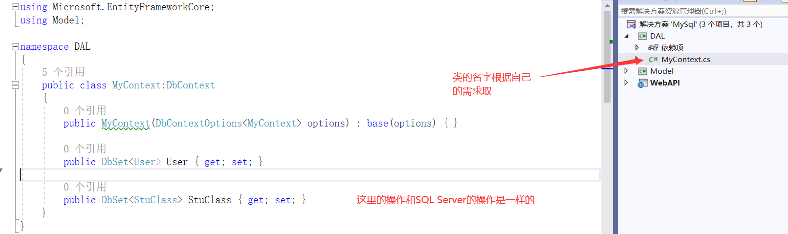 可以看出来链接SQL Server和MySql需要引用的NuGet包只有一个之差