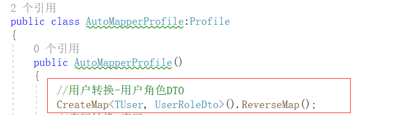 第一步:在这个构造函数中写出要进行映射的实体类,这里ReverseMap()是反转的意思,这样两个可以互相映射,如果没有写这个那么只能TUser和UserRoleDto进行映射