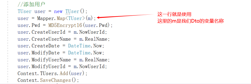 我们通过AutoMapper将UserRoleDTO中属于User的属性赋值给User
