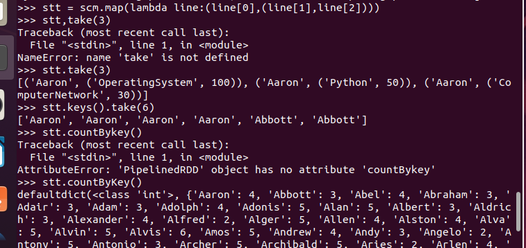 生成(姓名,课程分数)键值对RDD,观察keys(),values()