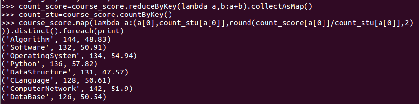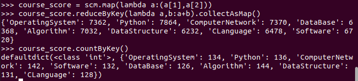 求每门课的选修人数及平均分。用reduceByKey()实现,并比较与combineByKey()的异同。