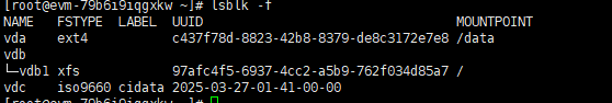 MOUNTPOINT 列显示挂载点(如 /、/home),空则表示未挂载。可以看到vda数据盘未挂载
