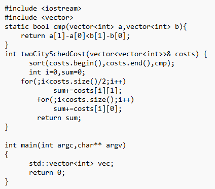 公司计划面试 2N 人。第 i 人飞往 A 市的费用为 costs[i][0],飞往 B 市的费用为 costs[i][1]。返回将每个人都飞到某座城市的最低费用,要求每个城市都有 N 人抵达。 示例: 输入:[[10,20],[30,200],[400,50],[30,20]](第i个人飞往两个城市的费用) 输出:110 |