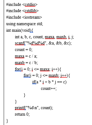 给定一个二元一次方程: ax + by = c 输入a b c,然后输出所有可能解的个数。 限定条件: a,b,c 均为正整数,x,y为非负整数。 |