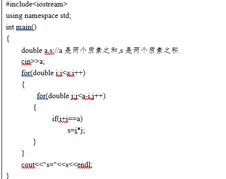 两个质数的和是S,它们的积最大是多少? 输入数据为S(0<=S<=10000),输出数据为一个整数,为两个质数的最大乘积,数据保证有解。 |