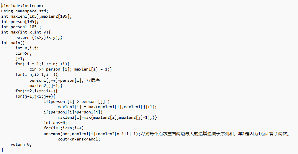 N位同学站成一排,音乐老师要请其中的(N-K)位同学出列,使得剩下的K位同学不交换位置就能排成合唱队形。 合唱队形是指这样的一种队形:设K位同学从左到右依次编号为1, 2, …, K,他们的身高分别为T1, T2, …, TK,则他们的身高满足T1 < T2 < … < Ti , Ti > Ti+1 > … > TK (1 <= i <= K)。你的任务是,已知所有N位同学的身高,计算最少需要几位同学出列,可以使得剩下的同学排成合唱队形。 输入,输入的第一行是一个整数N(2 <= N <= 100),表示同学的总数。第一行有n个整数,用空格分隔,第i个整数Ti(130 <= Ti <= 230)是第i位同学的身高(厘米)。 输出,输出包括一行,这一行只包含一个整数,就是最少需要几位同学出列。 样例输入8 185 186 150 200 160 130 197 220 样例输出4 |