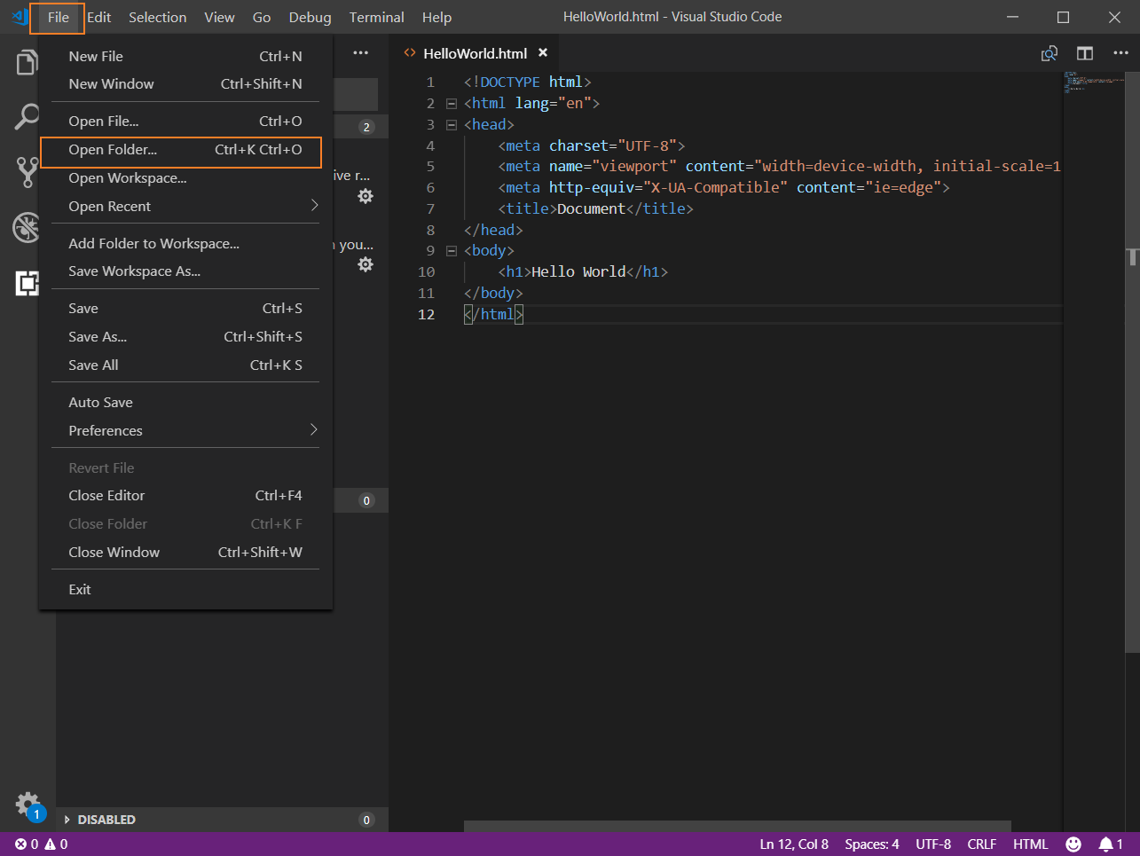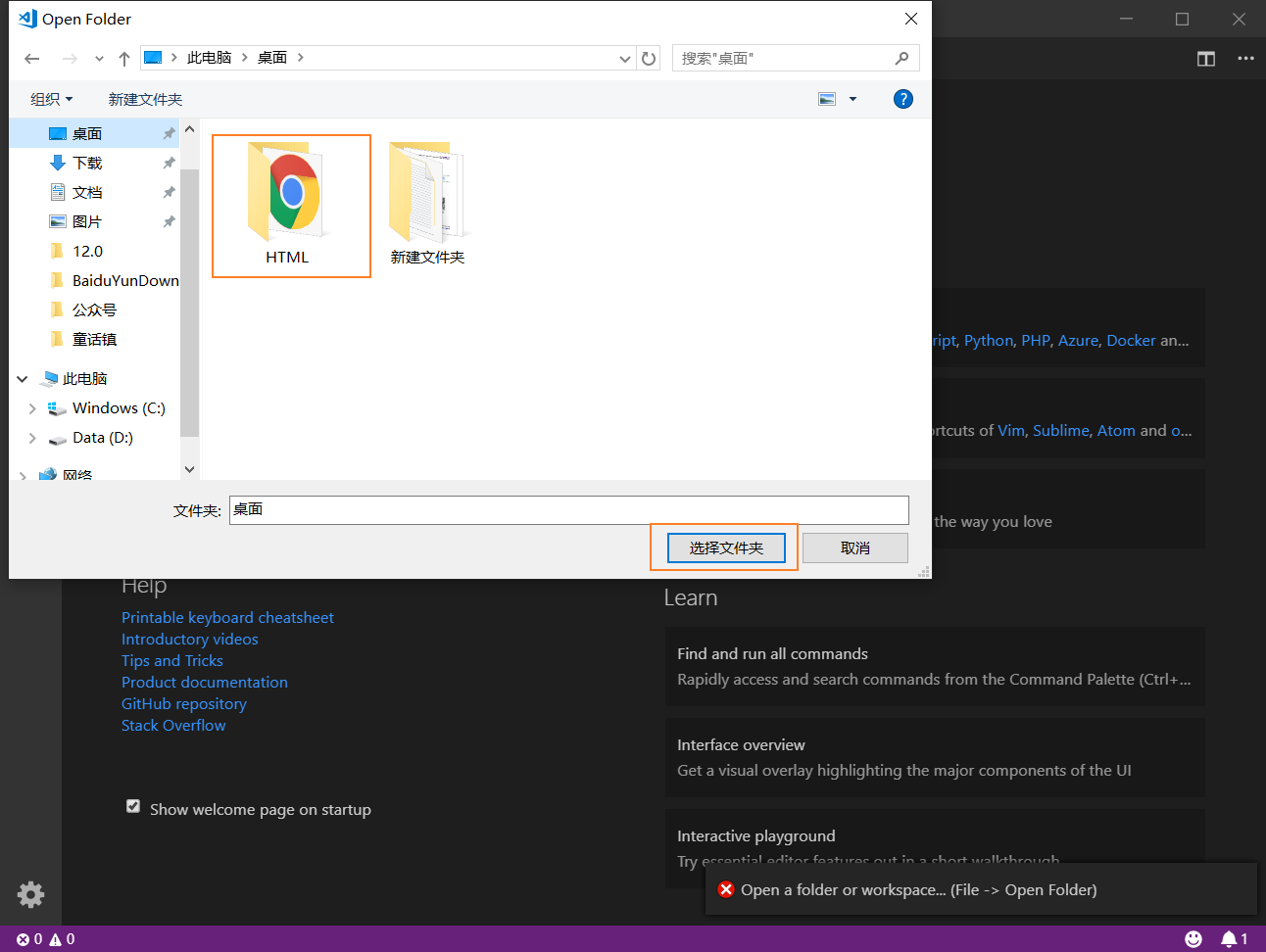 第二步:使用live—server时,点击file—Open Folder选择一个文件夹