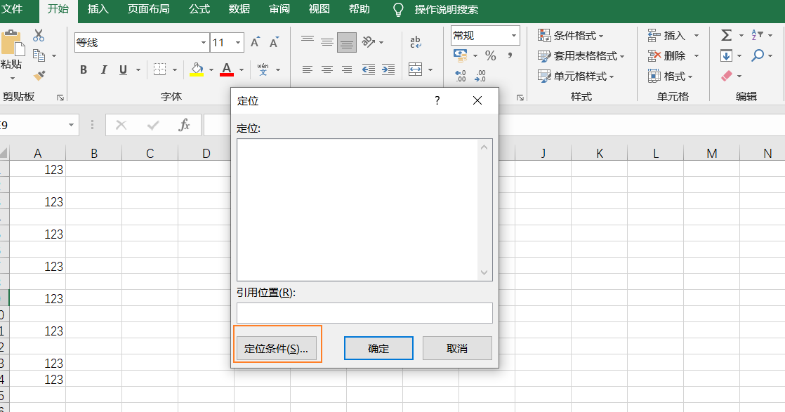 第一步:按下Ctrl+G或F5弹出定位对话框,选择定位条件