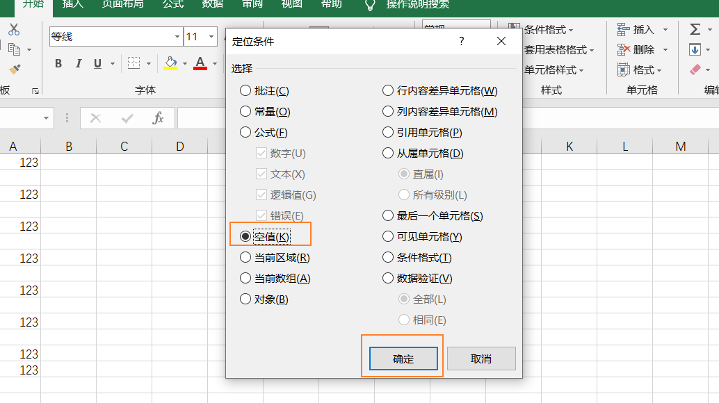 空值,再点击确定就可以选择所有空行了