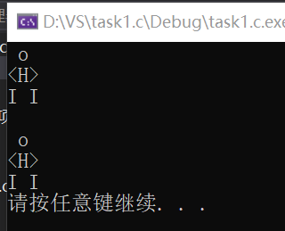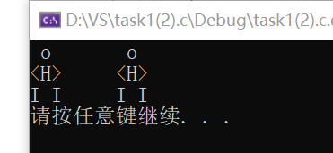 #include<stdio.h> #include<stdlib.h> int main() { printf(" o\t"); printf(" o\n"); printf("<H>\t"); printf("<H>\n"); printf("I I\t"); printf("I I\n"); system("pause"); return 0; }