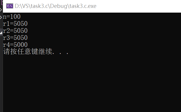 #include<stdio.h> #include<stdlib.h> int main() { int n, r1, r2, r3, r4; n = 100; r1 = n * (n + 1) / 2; r2 = (n + 1) * n / 2; r3 = n / 2 * (n + 1); r4 = (n + 1) / 2 * n; printf("n=%d\n", n); printf("r1=%d\n", r1); printf("r2=%d\n", r2); printf("r3=%d\n", r3); printf("r4=%d\n", r4); system("pause"); return 0; }