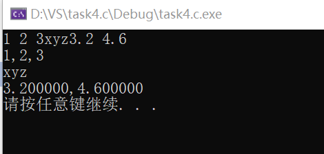 #define _CRT_SECURE_NO_WARNINGS #include<stdio.h> #include<stdlib.h> int main() { double x, y; char c1, c2, c3; int a1, a2, a3; scanf("%d%d%d", &a1,&a2,&a3); printf("%d,%d,%d\n", a1, a2, a3); scanf("%c%c%c", &c1, &c2, &c3); printf("%c%c%c\n", c1, c2, c3); scanf("%lf%lf", &x, &y); printf("%lf,%lf\n", x, y); system("pause"); return 0; }