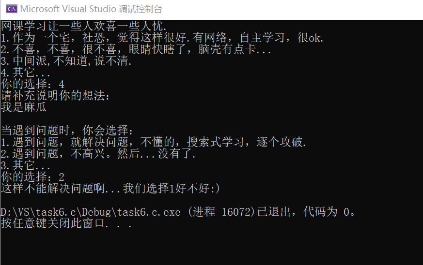 #define _CRT_SECURE_NO_WARNINGS #include<stdio.h> int main() { int answer; char words[5000]; printf("网课学习让一些人欢喜一些人忧.\n"); printf("1.作为一个宅,社恐,觉得这样很好.有网络,自主学习,很ok.\n"); printf("2.不喜,不喜,很不喜,眼睛快瞎了,脑壳有点卡...\n"); printf("3.中间派,不知道,说不清.\n"); printf("4.其它...\n"); printf("你的选择:"); scanf("%d", &answer); if (answer == 4) { printf("请补充说明你的想法:\n"); getchar(); gets_s(words); } printf("\n"); printf("当遇到问题时,你会选择:\n"); printf("1.遇到问题,就解决问题,不懂的,搜索式学习,逐个攻破.\n"); printf("2.遇到问题,不高兴。然后...没有了.\n"); printf("3.其它...\n"); printf("你的选择:"); scanf("%d",&answer); if (answer == 1) printf(":)\n"); else if (answer == 2) printf("这样不能解决问题啊...我们选择1好不好:)\n"); else if (answer == 3) { printf("请补充说明你的想法:\n"); getchar(); gets_s(words); } return 0; }