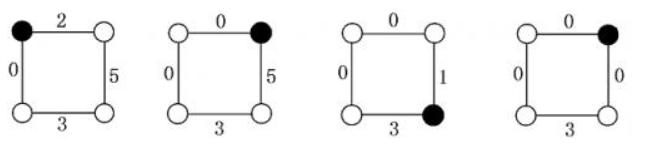 如下图,描述的是Alice和Bob两人的对弈过程,其中黑色节点表示硬币所在节点。结果图(d)中,轮到Bob走时,硬币两边的边上都是0,所以Alcie获胜。