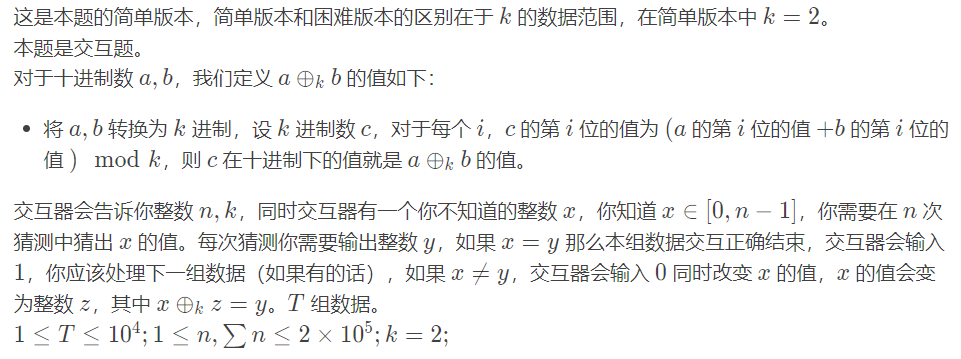 之后再枚举从0往后猜,第一次猜0,之后每次猜i⊕(i-1),就可以做到猜i的效果。