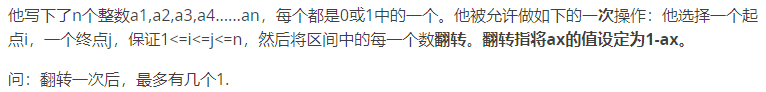 思维,最大子段和。要将某个区间反转,那也就是说这个区间里原来0的数量要尽可能多,1的数量尽可能少。可以这样假设,1的贡献是-1,0的贡献是1,那原样例10010,就变成了-1 1 1 -1 1。也就是求这个序列的最大子段和,也就求出了能够提供最大新贡献的区间。最后再加上原有1的数量。这样的写法有一个缺陷,就是数列里可能有全1,答案不应该输出序列长度,因为题目要求必须反转,那么就只反转一个好了,需要加个特判。