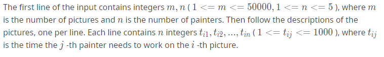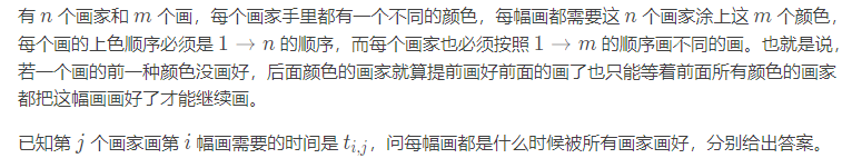 f[i][j]代表第i幅画最后一次被j画了所花的时间,受到两个的限制,画当前这个画的前一个画家画完了,当前这个画家画完了前面那张画了,取max。