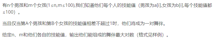 如果对于一个 a 数列中的一个最小的数a[x],它可能和多个在 b 数列的数相匹配,显然,我需要先试试 b 数列中最小的一个 b[y],如果可行,那么赶紧配对,再试试 a 数列中第 2 小和 b 数列中第 2 小的;否则,如果 a[x] >b[y] 说明既然 b 数列最小的已经不行了,那么我们就要再次将最小的和 a 匹配,反之亦然,最后以此类推,发现只是一个不断找最小值的过程,所以就要先排序。