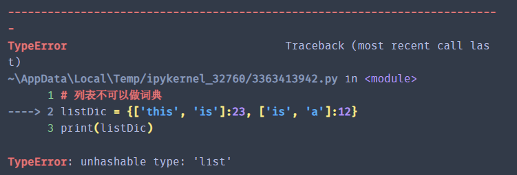 1 # 列表不可以做词典 2 listDic = {['this', 'is']:23, ['is', 'a']:12} 3 print(listDic)