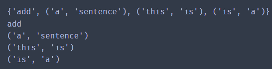1 # 元组可以是集中中的词,但是列表不可以 2 A = {('this', 'is'), ('is', 'a'), ('a', 'sentence')} 3 A.add('add') 4 print(A) 5 for x in A: 6 print(x)
