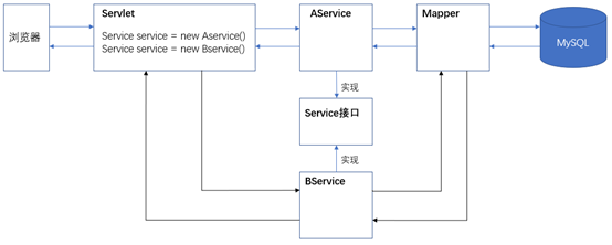 正常来说:Servlet调用Aservice类中的方法,Service再调用Mapper操作数据库。