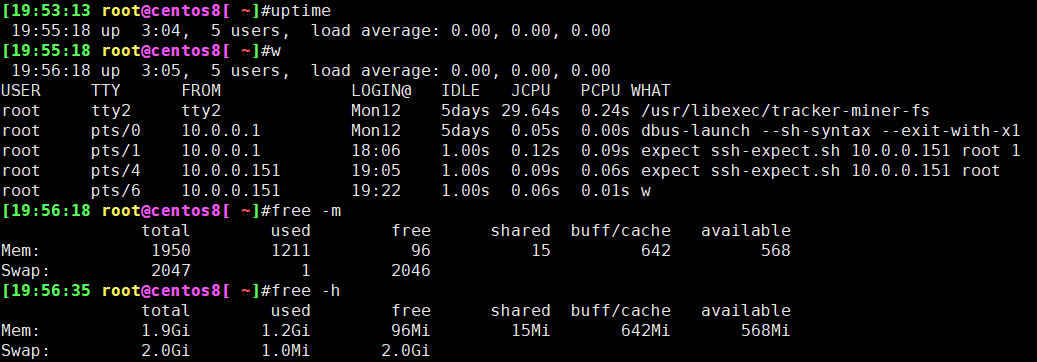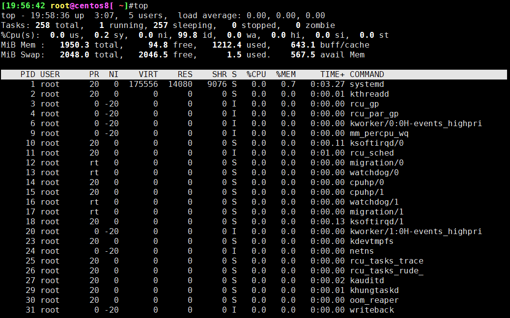 第1行:系统时间、运行时间、登录终端数、系统负载(三个数值分别为1分钟、5分钟、15分钟内的平均值,数值越小意味着负载越低)。