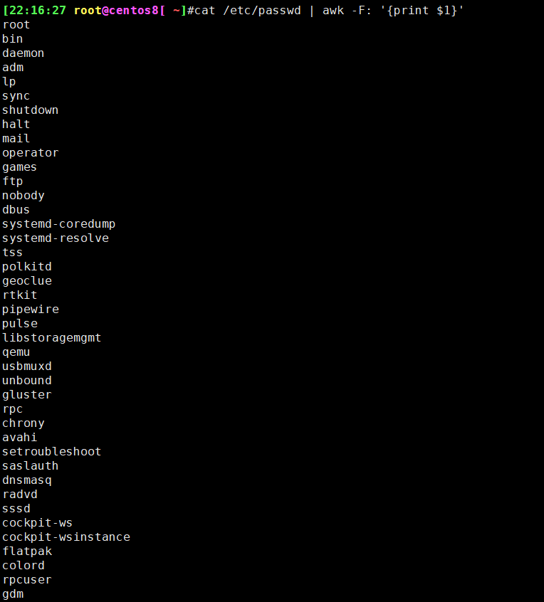 9、使用awk以冒号分隔获取/ettc/passwd文件第一列
