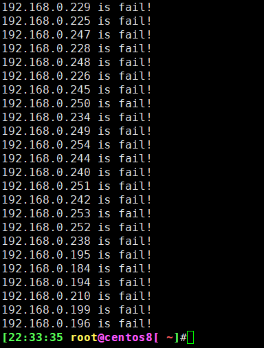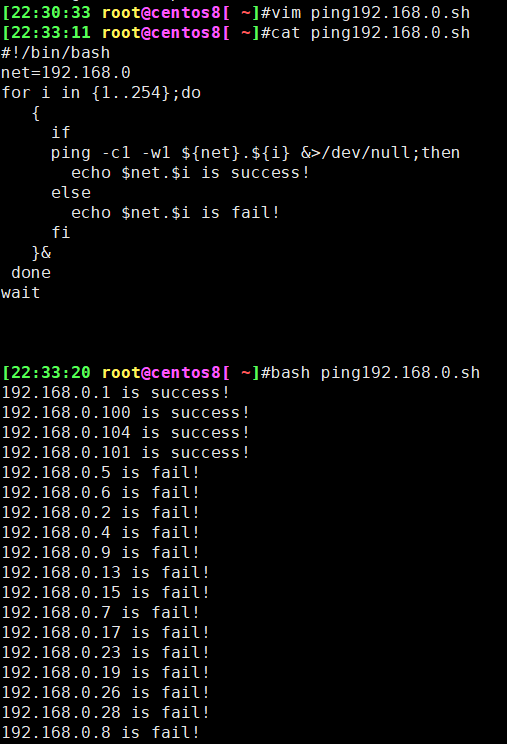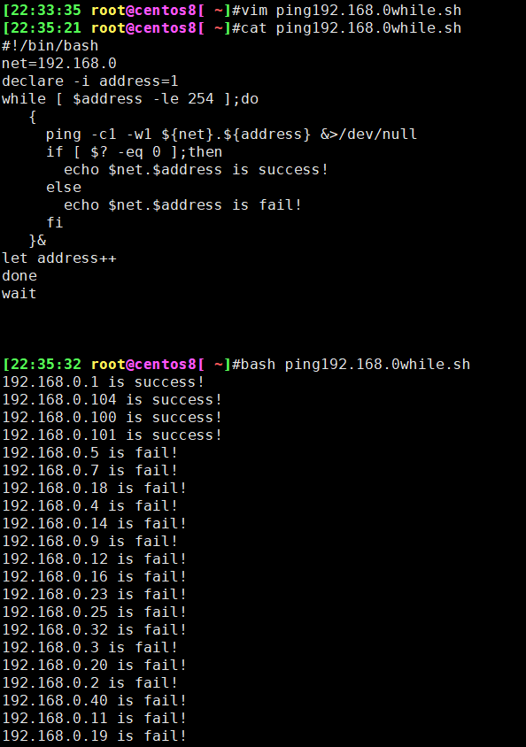 5、编写脚本,使用for和while分别实现192.168.0.0/24网段内,地址是否能够ping通,若ping通则输出"success!",若ping不通则输出"fail!"