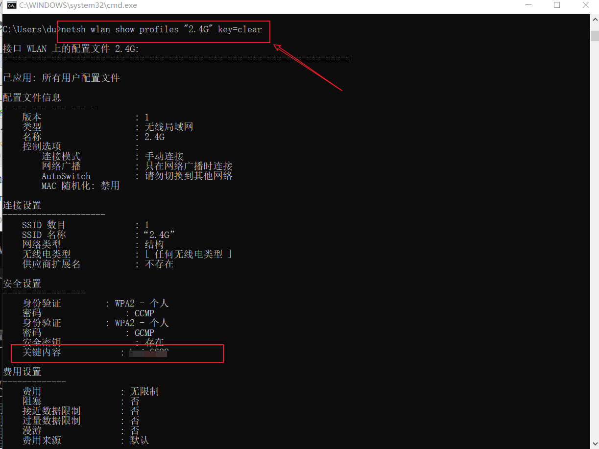 netsh wlan show profiles "需要查看的wifi的名字" key=clear