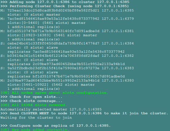 #6385作为master节点加入 redis-cli --cluster add-node 127.0.0.1:6385 127.0.0.1:6379 #6386作为6385的slave节点加入 redis-cli --cluster add-node 127.0.0.1:6386 127.0.0.1:6385 --cluster-slave |