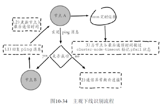 注意:下线报告的有效期限是server.cluster_node_timeout*2,如果在cluster-node-time*2时间内无法收集到一半以上槽节点的下线报告,那么之前的下线报告将会过期,也就是说主观下线上报的速度追赶不上下线报告过期的速度,那么故障节点将永远无法被标记为客观下线从而导致故障转移失败。因此不建议将cluster-node-time设置得过小,伪代码如下: