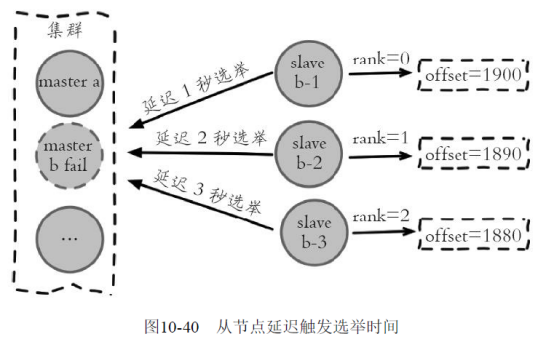 主节点b进入客观下线后,它的三个从节点根据自身复制偏移量设置延迟选举时间,如复制偏移量最大的节点slave b-1延迟1秒执行,保证复制延迟低的从节点优先发起选举。