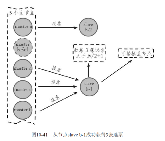 投票过程其实是一个领导者选举的过程,如集群内有N个持有槽的主节点代表有N张选票。由于在每个配置纪元内持有槽的主节点只能投票给一个从节点,因此只能有一个从节点获得N/2+1的选票,保证能够找出唯一的从节点。所以集群主节点至少三个才能保证集群正常故障转移。