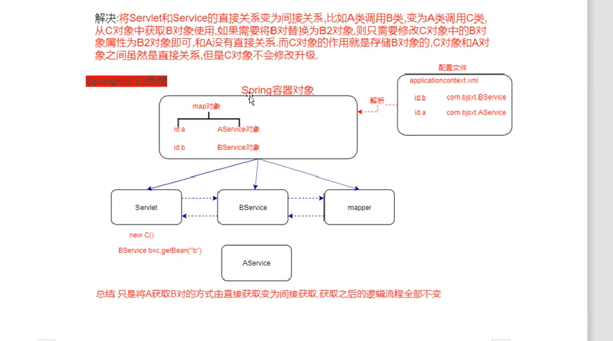 SpringIOC 将耦合性高的对象,放到Spring中,每次要用的时候,直接去配置文件中配置,配置完成之后,从容器中拿。
