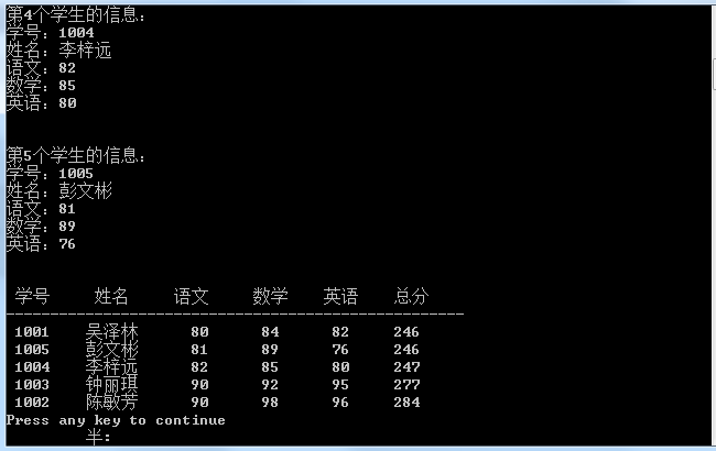 printf("\n 学号 姓名 语文 数学 英语 总分\n");