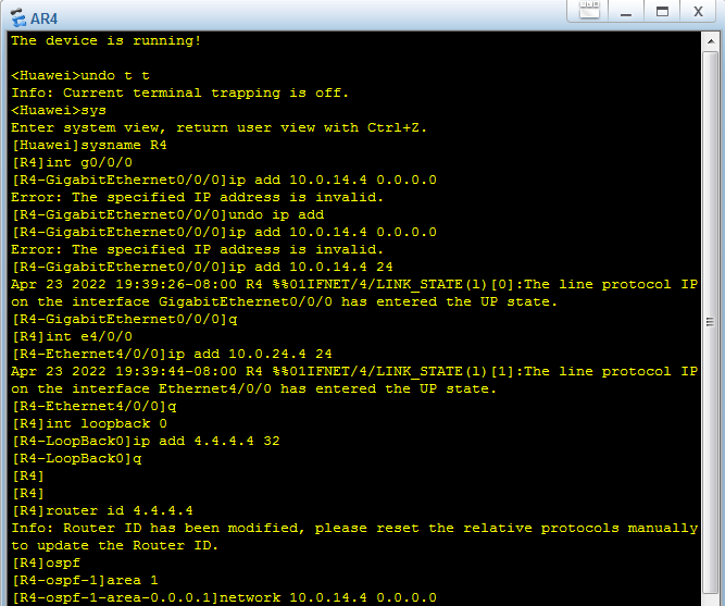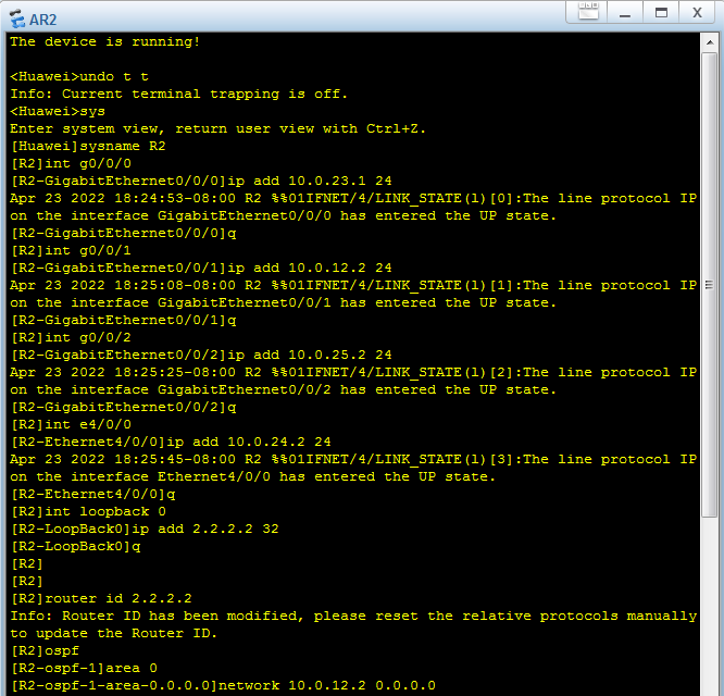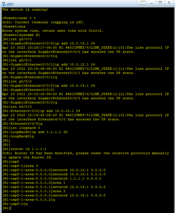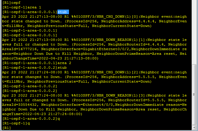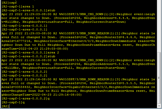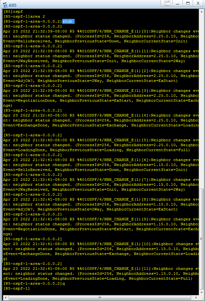 下面进行 Totally Stub 区域的配置。注意,由于分支路由器R4和R5与总部之间是双出口设计,所以每个区域中都存在两台ABR。