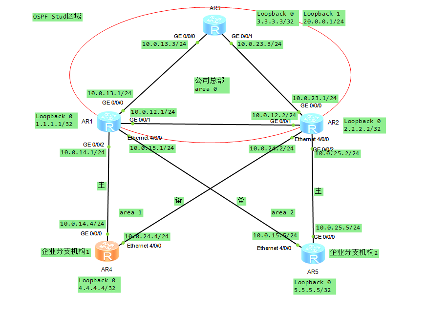 企业外部网络。网络的最终需求是:不同分支机构通过不同的总部路由器访问总部网络及外网,并实现主备备份,即R4与R1之间为分支机构1的主用链路,R4与R2之间为其备用链路;R5与R2